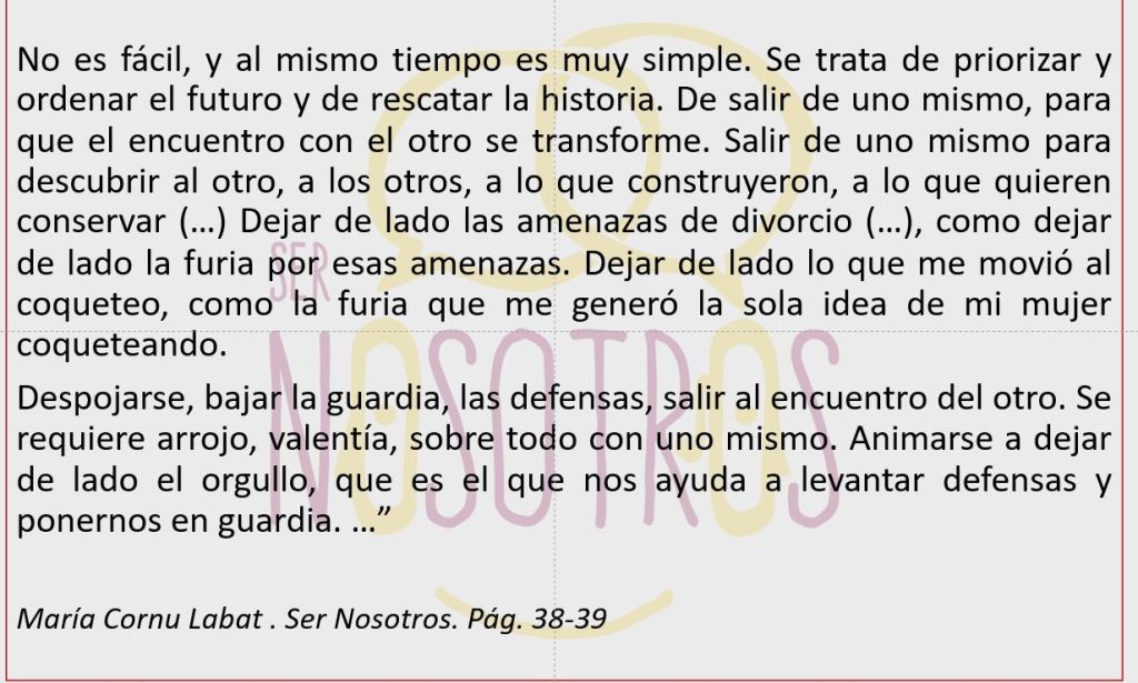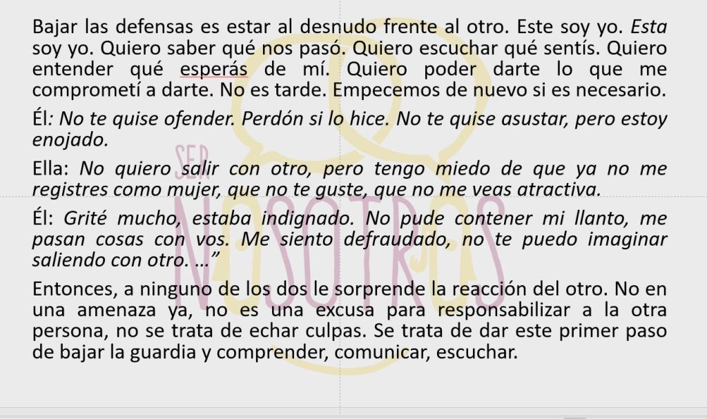 Cuidando al otro, ante todo. Cuidando el nosotros. ¿Y no me tengo que cuidar a mí? Por supuesto, por eso no voy a dejar pasar esta necesidad de hablar, o confrontar. Pero, como también me cuido a mí, te cuido a vos, nos cuido a nosotros.